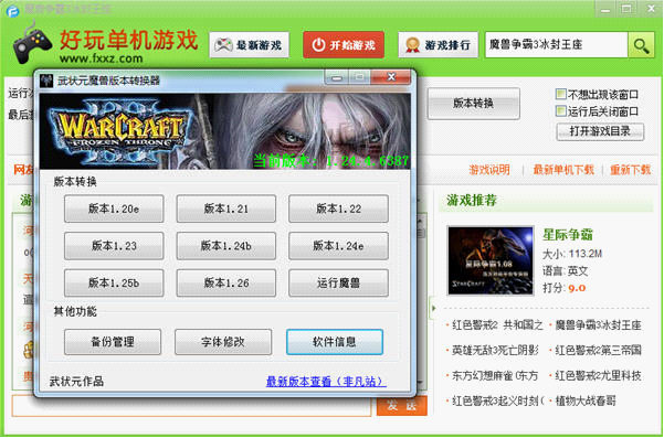 在这款魔兽争霸的safew下载中我们为玩家放入了版本转换的工具,点击上图中的版本转换按钮即会出现版本转换器,让玩家想玩什么版本都可以一键搞定,方便无比。